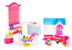 - Bogate akcesoria: tablica z półkami, umywalka, domek, stoliczek, 4 krzesełka, kuchenka, pociąg z 3 wagonami oraz drobne dodatki.