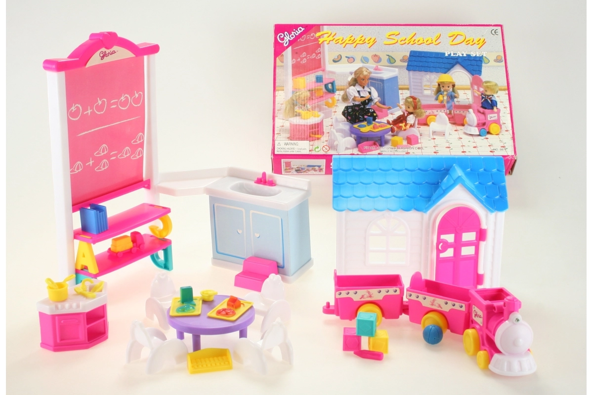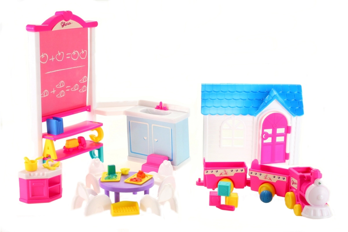 Rozszerz świat zabawy o kompletny zestaw Glorie przedszkole, który oferuje dużą tablicę z półkami, umywalkę, domek z otwieranymi drzwiczkami, dziecięce krzesełka i stoliczek, kuchenkę, pociąg z trzema wagonami oraz mnóstwo akcesoriów i naczyń. Idealny do rozwoju wyobraźni, umiejętności społecznych i małej motoryki. Lalki nie są częścią zestawu.