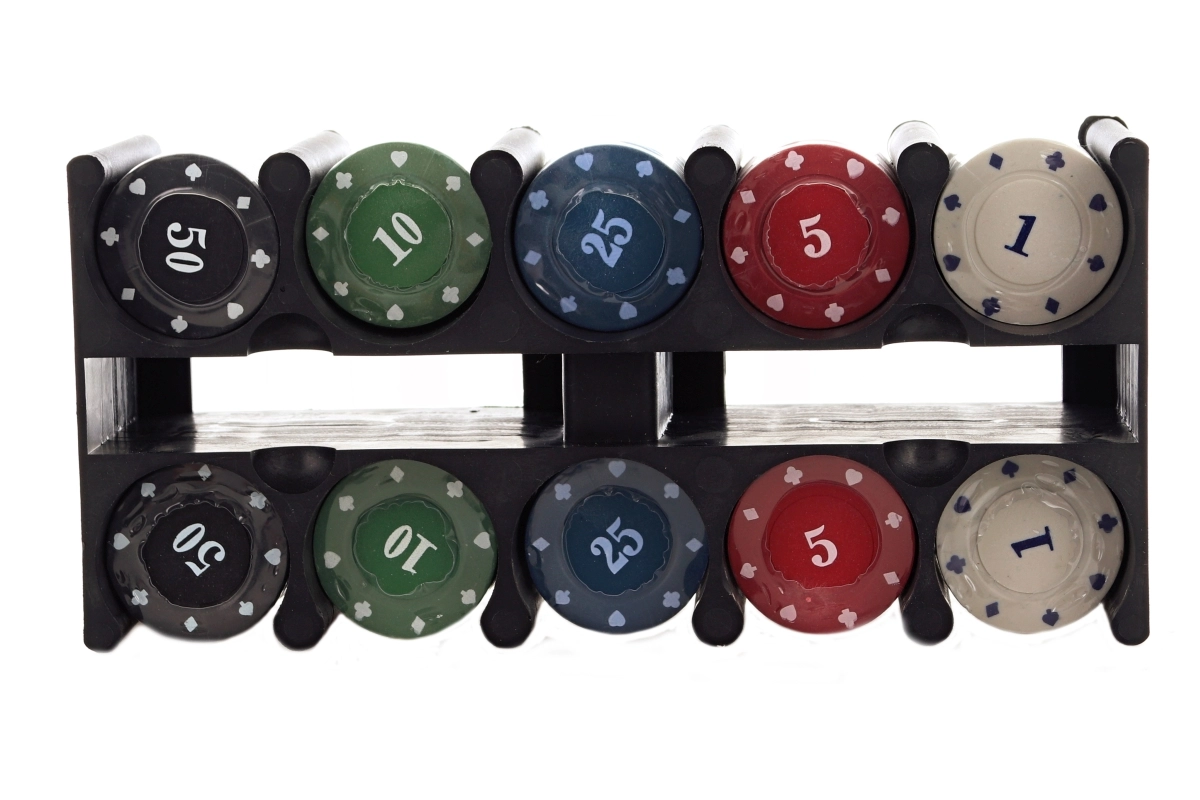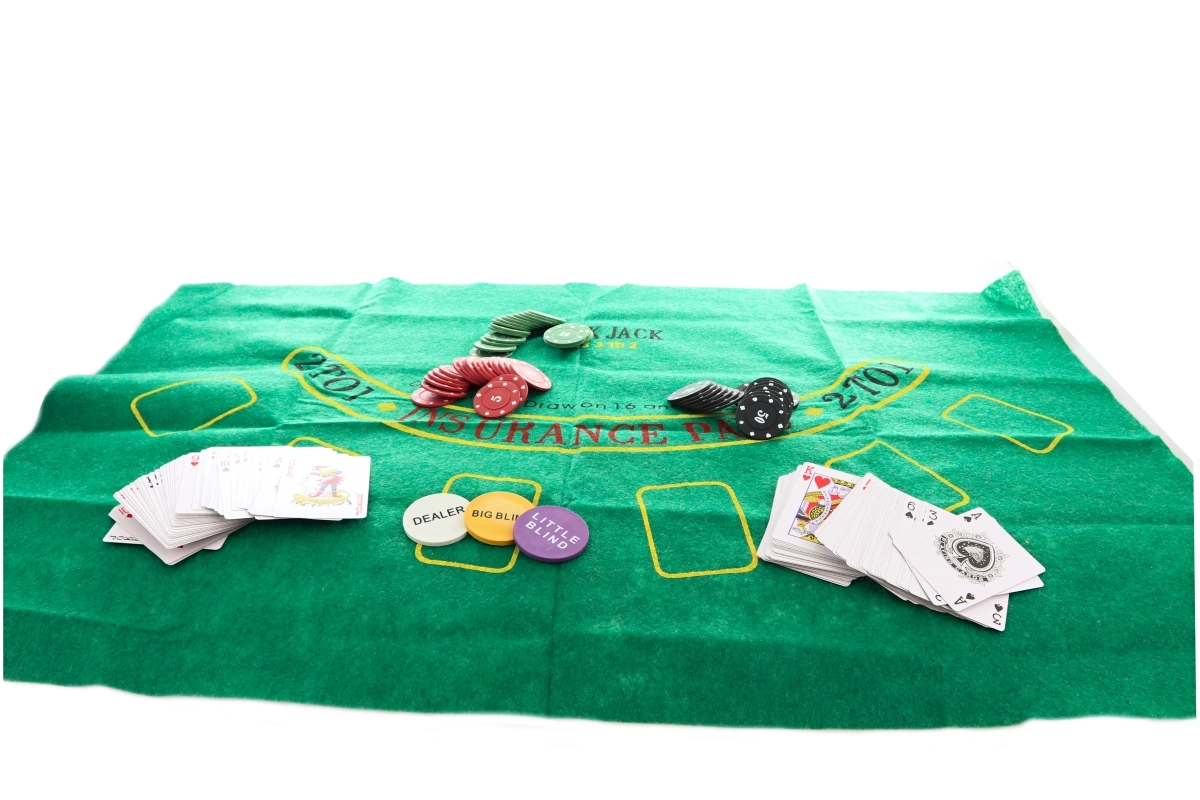 Zestaw zawiera żetony w różnych kolorach i wartościach, karty do gry i przycisk dealera dla autentycznych wrażeń z gry.