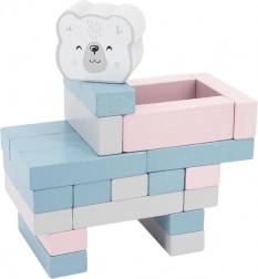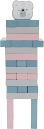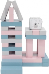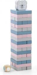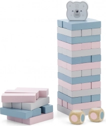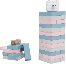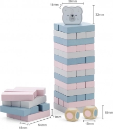 Zestaw zawiera 56 drewnianych bloków i 2 kostki dla wielu wariantów gry.