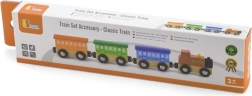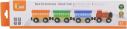 Drewniany zestaw Klasyczny pociąg zawiera 4 części, które są połączone magnesami. Ta zabawka została zaprojektowana przez renomowanego producenta drewnianych zabawek, firmę Viga Toys. Zestaw może być używany jako samodzielna zabawka, lub jako dodatek do innych torów kolejowych, konstrukcji i zestawów.
