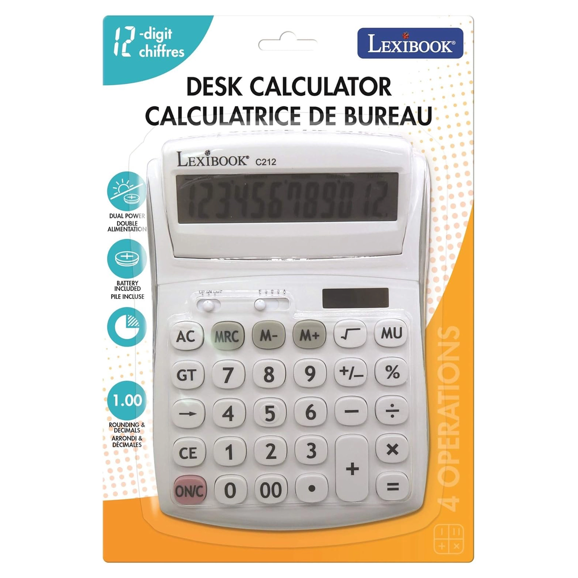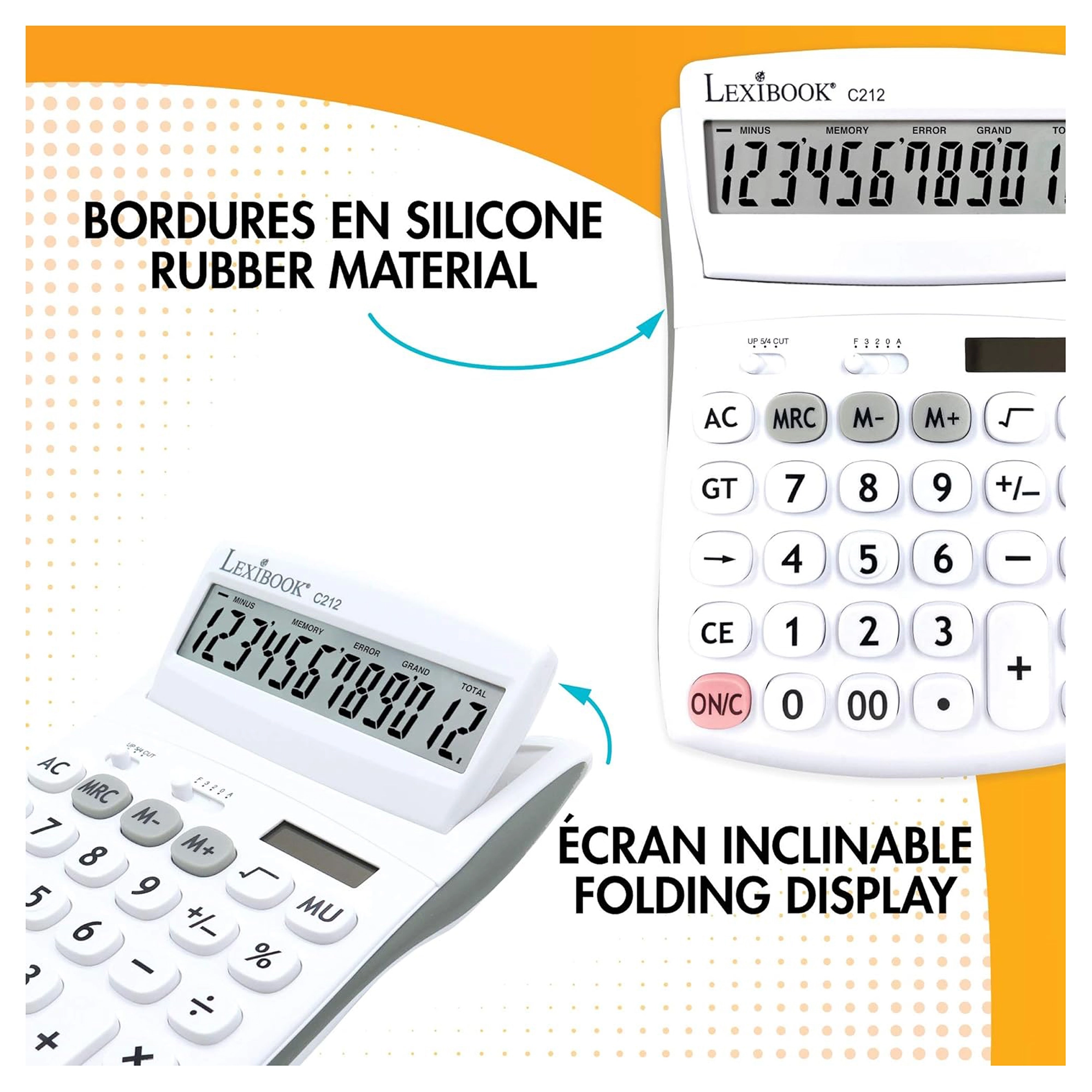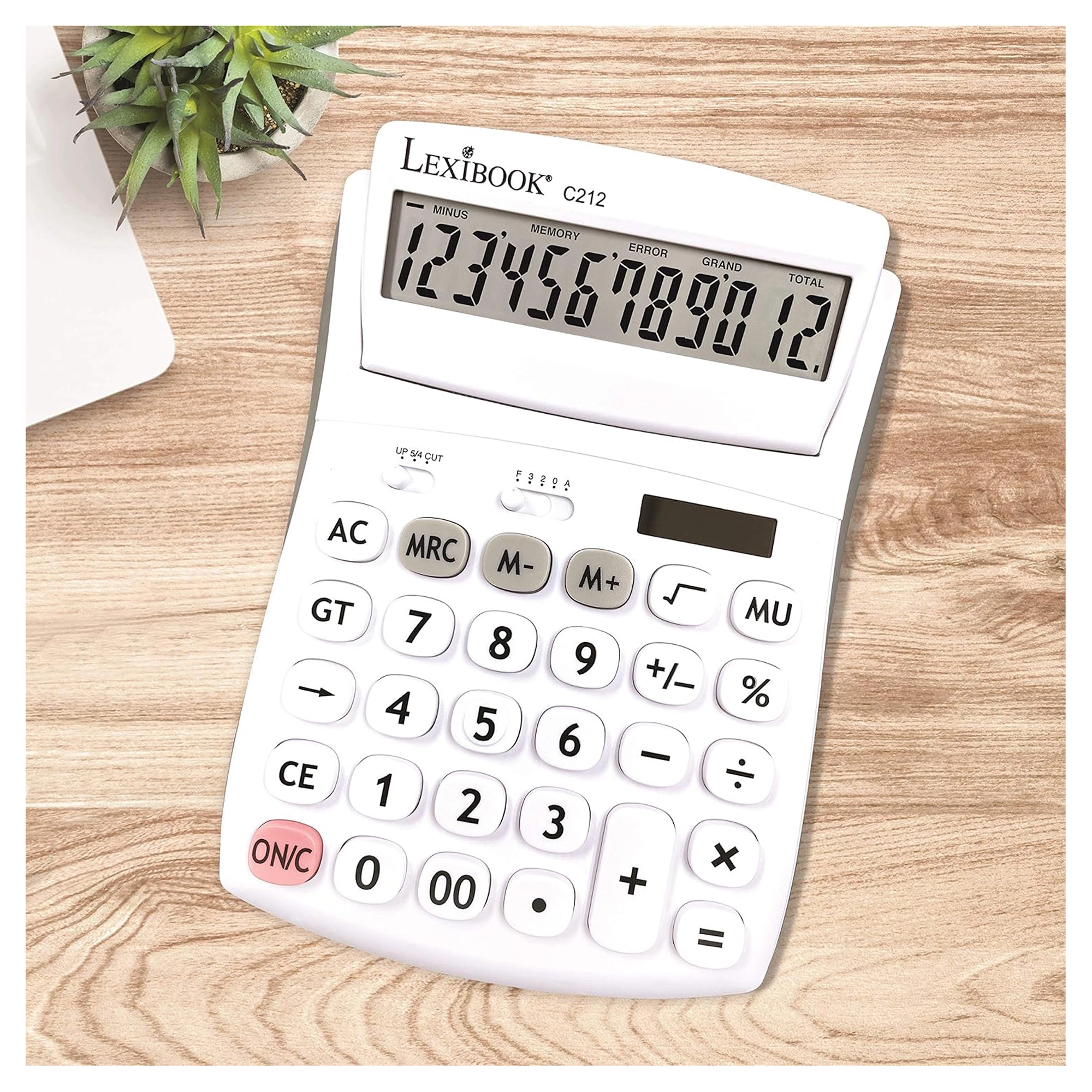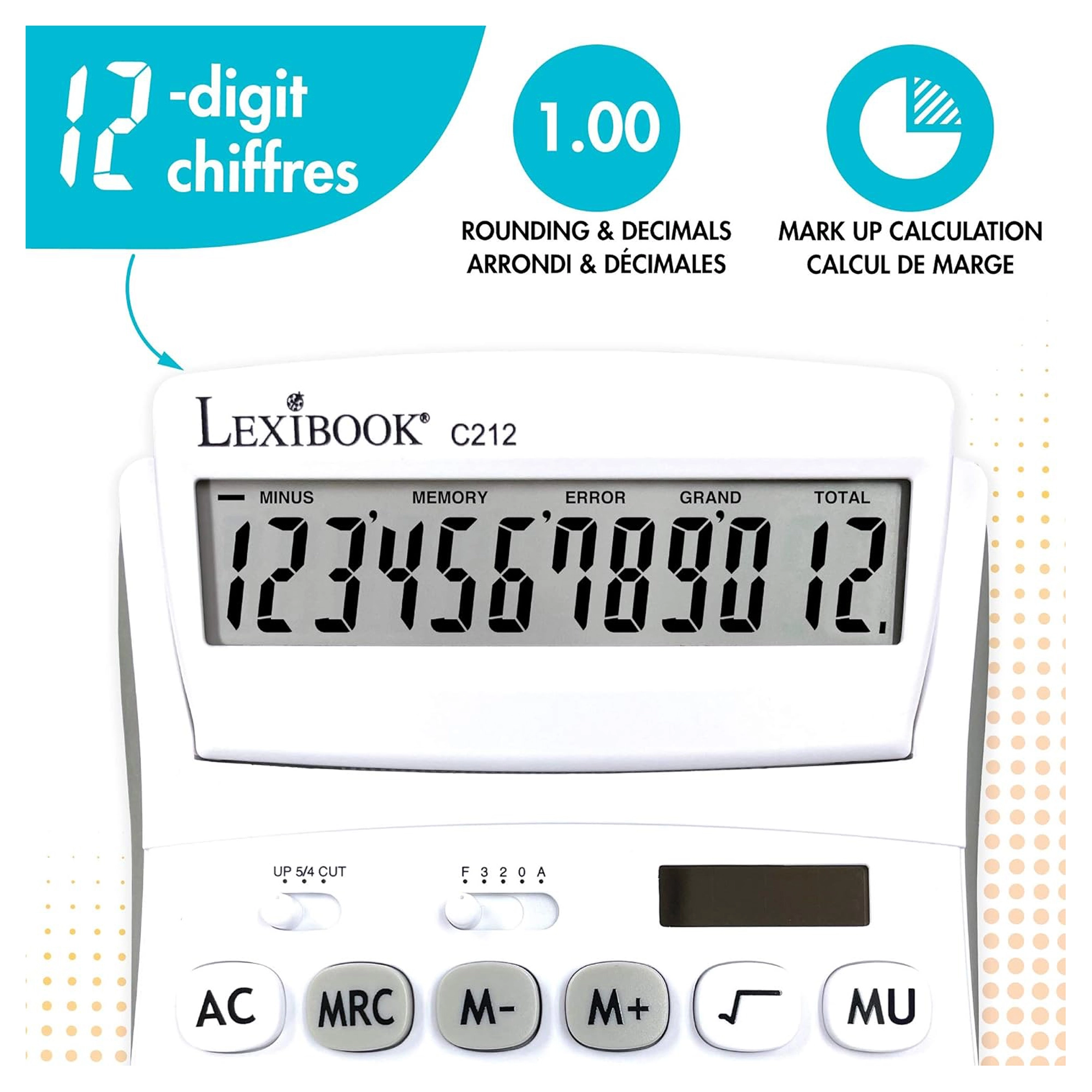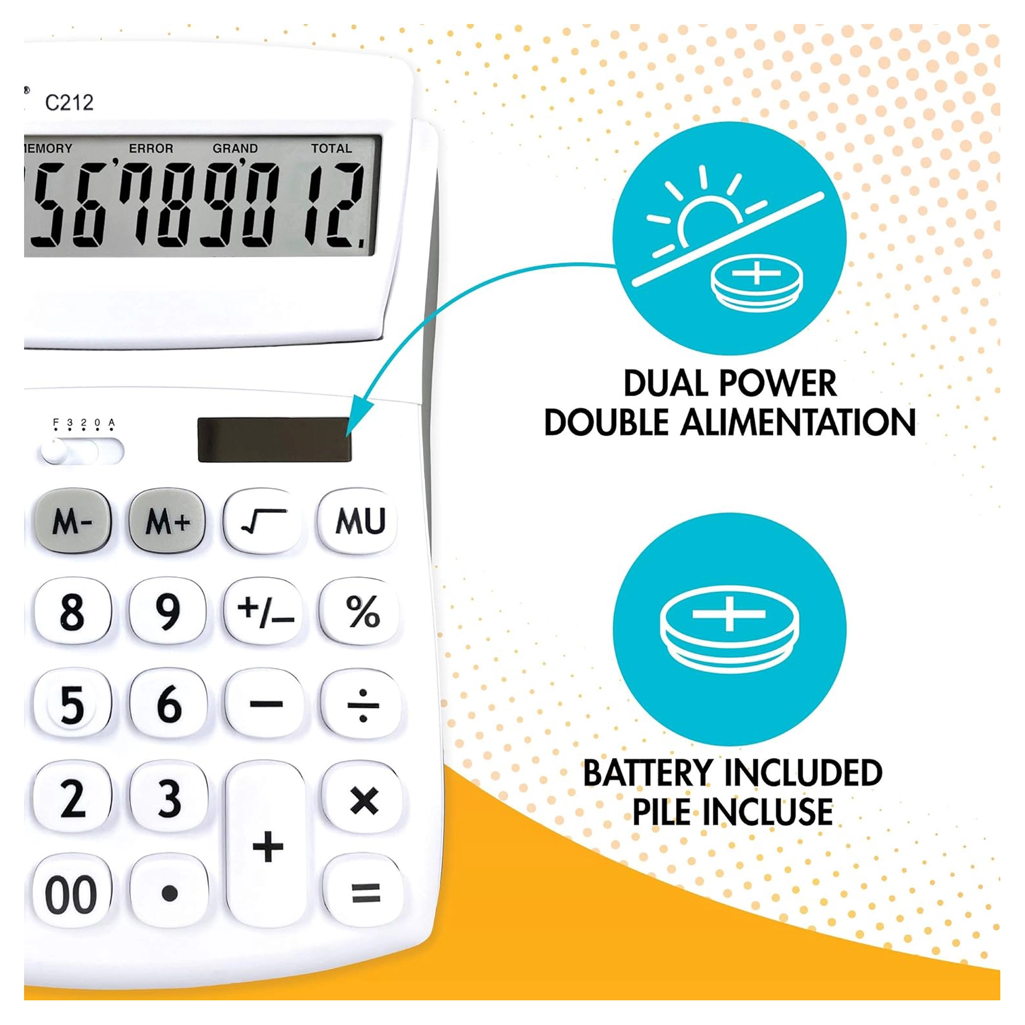 Praktyczny 12‑miejscowy kalkulator biurkowy do biura, szkoły i domu oferuje duży odchylany wyświetlacz, wytrzymałe gumowane przyciski oraz podwójne zasilanie (bateria AG10 + energia słoneczna). Umożliwia wybór miejsc po przecinku i zaokrąglanie, ma pamięć na 3 liczby, funkcje procentów, pierwiastka i obliczania marży, a także przycisk korekty do usuwania ostatnich cyfr.