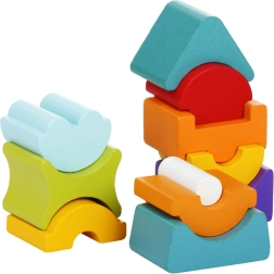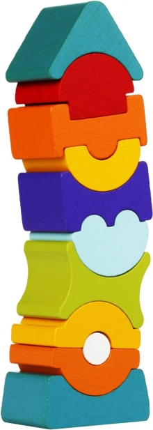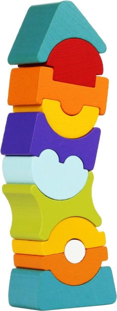 Zaokrąglone elementy pozwalają budować wieżę zarówno prosto, jak i z przechyłem. Dzieci ćwiczą cierpliwość, koordynację i wyobraźnię przestrzenną przy każdej próbie.