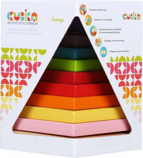 Marka Cubika oferuje ekologiczne drewniane zabawki z precyzyjnym wykonaniem i atrakcyjnym designem. Kolorowa piramida to układanka składająca się z 9 elementów, które można złożyć w kształt piramidy. Ta zabawka nie tylko w zabawny sposób rozwija zdolności sensomotoryczne, ale także logiczne myślenie i kreatywność.