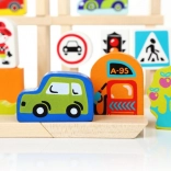 Transportowa konstrukcja w mieście przyciąga dzieci dzięki połączeniu kolorowych drewnianych klocków, które można zestawić w postać ruchliwego miasta pełnego aut, sygnalizacji świetlnej i stacji benzynowych. Doskonale rozwija zdolności sensoryczno-motoryczne, myślenie kreatywne i umiejętności logiczne.
