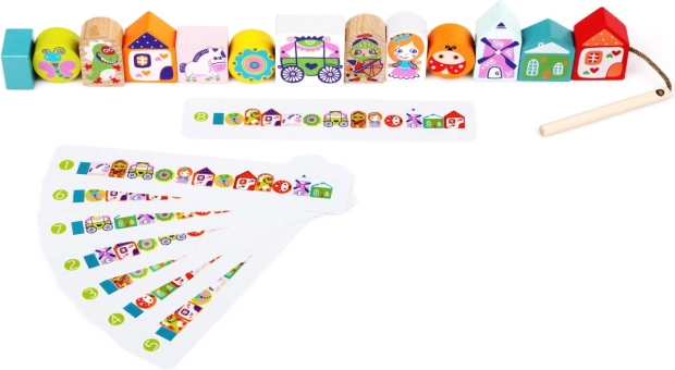 Zawiera 13 drewnianych części z bajkowymi motywami do zabawnego nawlekania.