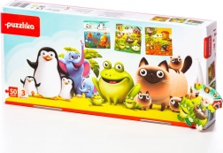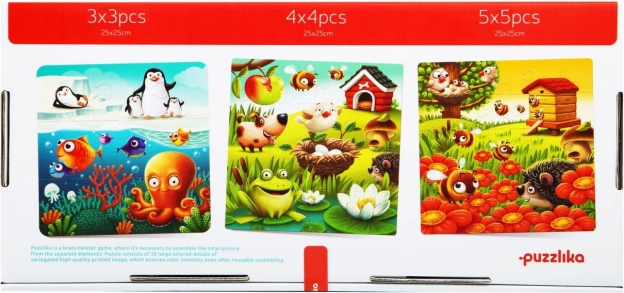 Odkryj naukę przez zabawę z puzzlami Puzzlika ulubione zwierzątka 3 w 1. Zestaw zawiera łącznie 50 dużych elementów, z których dzieci ułożą 3 osobne obrazki 25 × 25 cm o różnym poziomie trudności (3×3, 4×4, 5×5). Dzięki barwnym motywom zwierząt i wyrazistym kolorom układanie jest atrakcyjne i motywujące dla dzieci w wieku przedszkolnym.