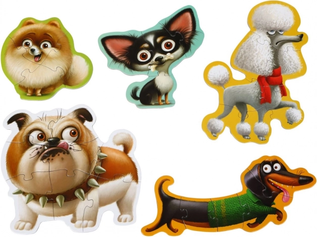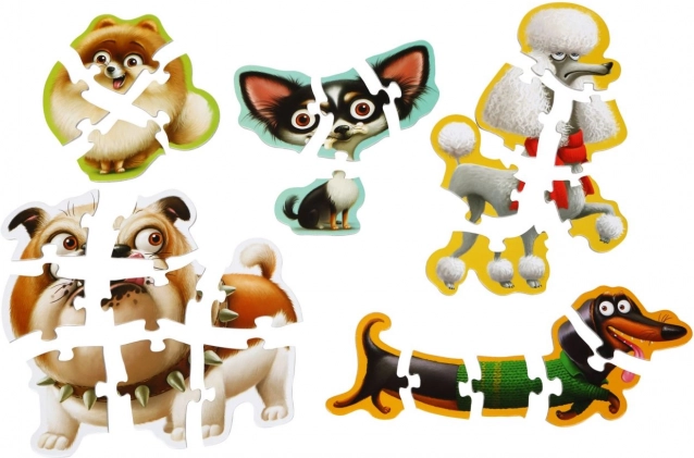 Odkryj zabawną naukę z puzzlami Puzzlika – zestaw 5 oddzielnych obrazków z pieskami łącznie z 27 dużych, solidnych elementów. Idealne dla małych dzieci, które podczas układania rozwijają logiczne myślenie, małą motorykę i kreatywność. Wyprodukowano w Europie z trwałego, wielowarstwowego kartonu z błyszczącą powłoką; łatwe w czyszczeniu i przyjazne dla środowiska.