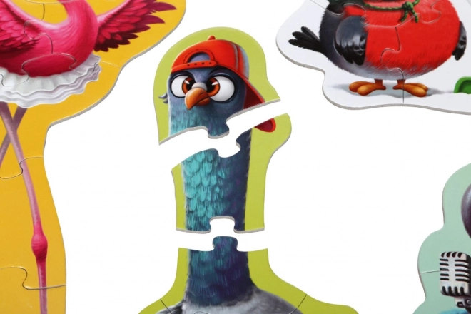 Z 25 dużych elementów ułożysz 5 oddzielnych puzzli z wesołymi ptaszkami. Każdy obrazek ma 4–7 elementów, co ułatwia stopniową naukę.