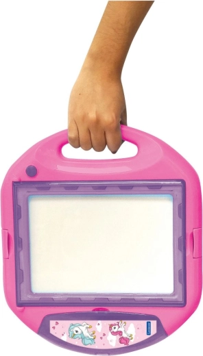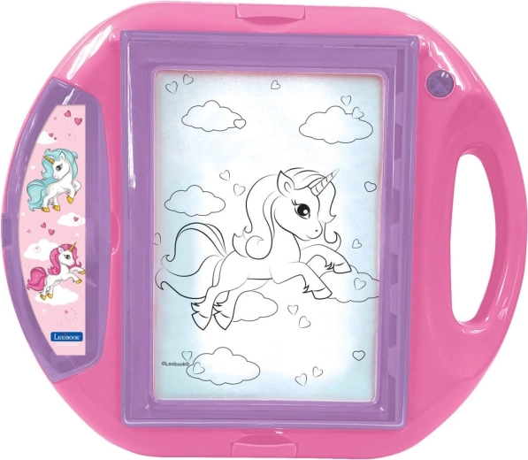 Projektor do rysowania w formacie A5 zawiera 10 szablonów i 4 stempelki z motywem bajkowego jednorożca. Pomaga małym artystom uczyć się rysować i jednocześnie świetnie się bawić. Jest bardzo łatwy w obsłudze dzięki podświetlanemu ekranowi i praktycznym ustawieniom, a całe akcesorium można w nim przechowywać, aby mieć wszystko pod ręką. Wystarczy umieścić jeden z szablonów pod plastikową osłoną, położyć na nim kartkę papieru, zamknąć pokrywę i rysować. Ekran podświetla się, aby wyświetlić szablon pod papierem i prowadzić dziecko podczas rysowania.