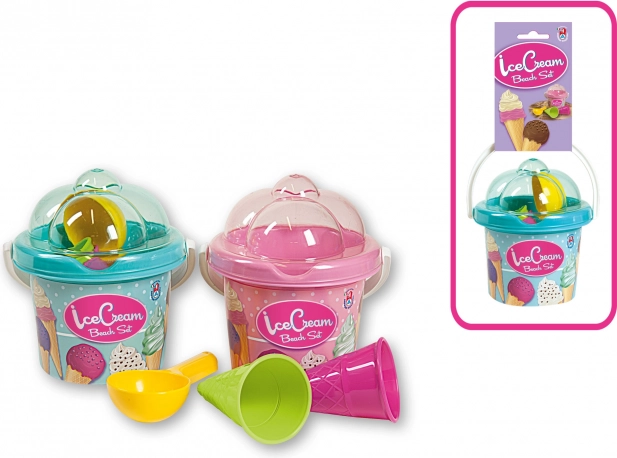 Uroczy dziecięcy zestaw do piasku w stylu lodów ucieszy każdego małego budowniczego. Zawiera wiaderko z pokrywką w kształcie pucharka, gałkownicę i 2 rożki. Wyprodukowano we Włoszech z wysokiej jakości plastiku, idealny dla dzieci od 12 miesięcy. Lekki, kompaktowy i świetny na piaskownicę oraz plażę.