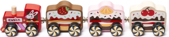 Wagoniki w stylu truskawkowego, cytrynowego i wiśniowego ciasta pobudzają wyobraźniową zabawę i czynią pociąg wyjątkowo atrakcyjną zabawką.