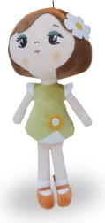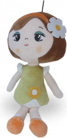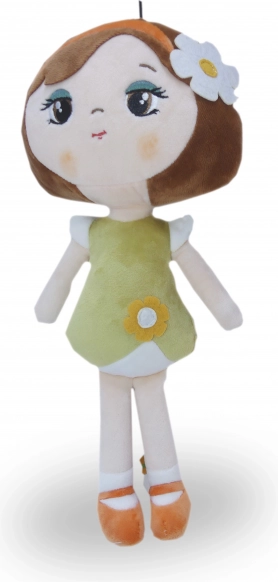 Pluszowa lalka Roma zachwyca delikatnym wyglądem – brązowe włoski z kwiatową ozdobą, oliwkowa sukienka z kwiatuszkiem i pomarańczowe buciki. Delikatny, gładki i błyszczący plusz jest przyjemny w dotyku i wprost zachęca do przytulania. Dzięki lekkiej konstrukcji dzieci z łatwością zabiorą ją wszędzie – do łóżeczka, w podróż czy w odwiedziny.