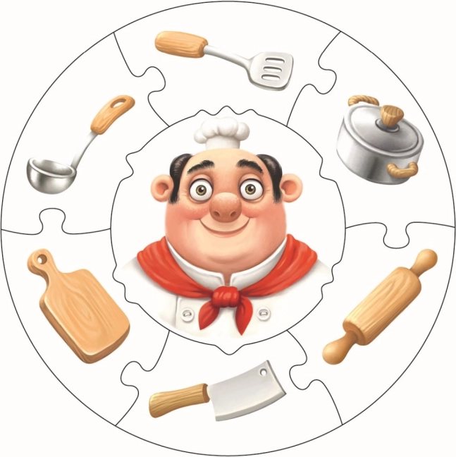 Ilustracja kucharza z akcesoriami (łyżka, garnek, wałek) wspiera rozwój logicznego myślenia i poznawanie codziennych czynności.