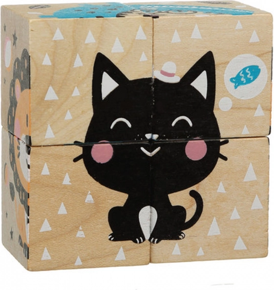 Drewniane układanki Radosne zwierzątka umożliwiają dzieciom ułożenie aż sześciu różnych obrazków z radosnymi zwierzątkami. Każda z czterech kostek jest starannie wykonana z ekologicznie hodowanego klonu i buka oraz pokryta bezpiecznymi farbami wodnymi. Kluczowe cechy: