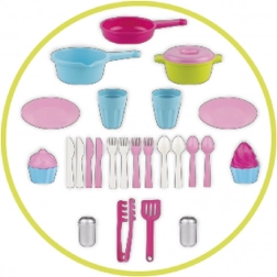 - Zawartość opakowania: zestaw sztućców dla 4 dzieci, szuflada na sztućce, piekarnik z blachą, płyta grzewcza, zlew z baterią, 3 garnki, 2 szklanki, 2 talerzyki, 2 szczypce, solniczka, pieprzniczka i 2x babeczka