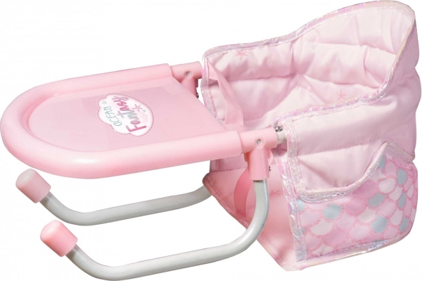 Stabilne mocowanie pod blat stołu (do grubości ok. 7 cm) oraz praktyczny tacka-pulpit ułatwiają karmienie lalki. Kompaktowe wymiary 38 × 28 × 14 cm oszczędzają miejsce w domu i w podróży.