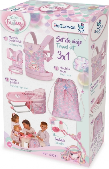 Zestaw podróżny dla lalek 3 w 1 Ocean Fantasy oferuje doskonale dopasowane akcesoria w delikatnych różowych tonach z wzorem morskich łusek i rozgwiazd. Dzieci będą się cieszyć wygodnym karmieniem lalki przy stole, łatwym przenoszeniem w nosidełku i szybkim spakowaniem wszystkiego do lekkiego worka. Precyzyjne wykonanie i hiszpański design gwarantują długą żywotność i świetny wygląd.