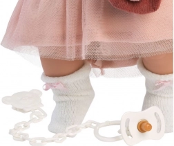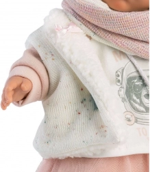 Lalka z manufaktury Llorens jest gwarancją jakościowej i bezpiecznej zabawy. Jest wykonana z maksymalną precyzją i używa tylko tkanin od renomowanych marek. Julia potrafi płakać i mówić 'mama' oraz 'tata', gdy wyjmie się jej smoczek. Jej piękny wygląd jest uzupełniony stylowym ubraniem: dwukolorową bluzą z nadrukiem, tiulową spódnicą, futrzaną kamizelką, białymi skarpetkami z kokardkami i różowym szalikiem, co tworzy idealny strój zapewniający godziny zabawy.