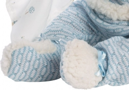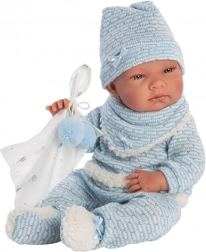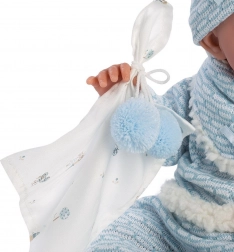 Oprócz modnego niebieskiego kocyka z uszami, który pasuje do jego ubrania, w zestawie znajduje się również dekoracyjny smoczek. Lalka jest zapakowana w atrakcyjne opakowanie prezentowe, które imituje dom marki Llorens.