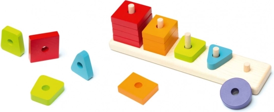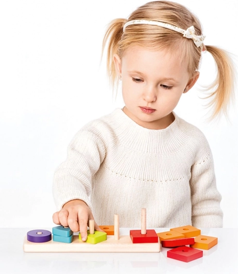 Dzięki różnym geometrycznym elementom i powtarzającym się kolorom dzieci łatwo opanują sortowanie, parowanie i prawidłowe umieszczanie na kołkach podstawy.