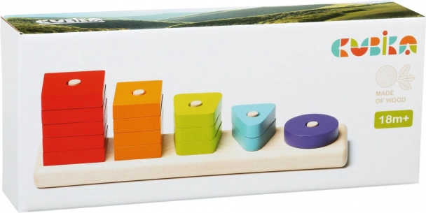 Drewniana układanka CUBIKA oferuje zabawną drogę do poznawania kształtów i kolorów. Na solidną kwadratową podstawę z kołkami dzieci nawlekają 15 kolorowych, perforowanych elementów – koła, trójkąty, kwadraty i inne proste figury geometryczne – przy czym naturalnie ćwiczą koordynację ręka–oko i koncentrację.