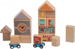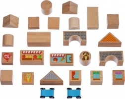 Zbuduj własne malownicze miasteczko z precyzyjnie wykonanych drewnianych klocków i wyrusz na przejażdżkę dwoma małymi autkami. Elementy o różnych kształtach – prostopadłościany, trójkąty, walce i mostki – świetnie się łączą i motywują dzieci do kreatywnego budowania oraz swobodnej zabawy.