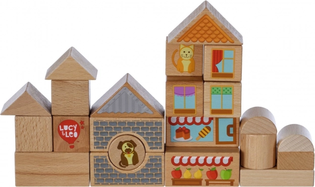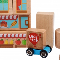 Odkryj magię kreatywnego budowania z drewnianym zestawem Lucy & Leo miasteczko. Zestaw zawiera 25 wysokiej jakości drewnianych elementów, w tym 2 jeżdżące autka, różne kształty i kolory do budowy domków i uliczek. Ilustrowane elementy, takie jak okna, dachy i witryny sklepowe, pobudzają wyobraźnię i tematyczną zabawę. Zabawka wspiera motorykę małą, logiczne myślenie i kreatywność, a po zabawie łatwo schowasz ją do praktycznego okrągłego pudełka z pokrywką i rączką.