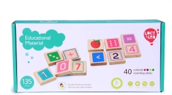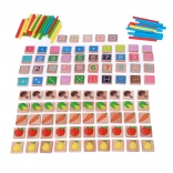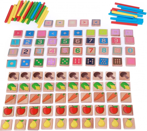 W zestawie znajdują się drewniane karty z liczbami, kropkami jak na kostkach, obrazkami owoców i warzyw, a także znaki matematyczne i kolorowe patyczki do liczenia o długości 8 cm. Elementy są przyjemne w dotyku i trwałe do codziennej zabawy.