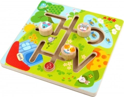 Drewniany labirynt Słoneczna Dolina daje dzieciom radość odkrywania i nauki. Ilustrowana plansza ze stawem i zielenią wciąga do zabawy, w której pies, kot i myszka podążają do swoich celów. Dzięki płynnym rowkom figurki łatwo się przesuwają, a zabawa jest bezpieczna i intuicyjna.