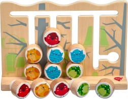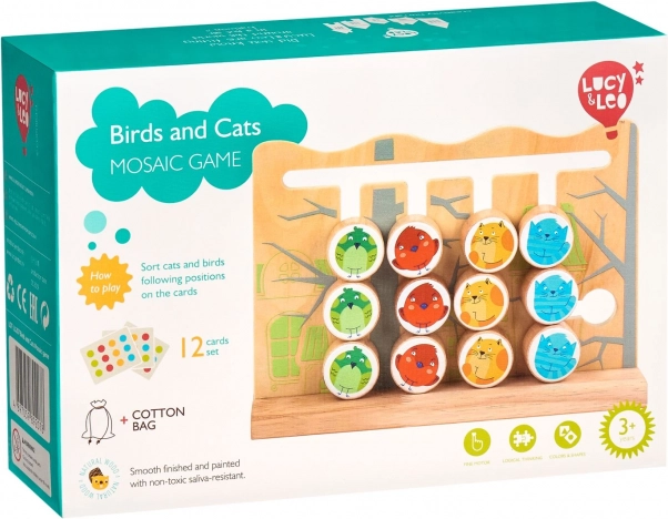 Odkryj zabawną drewnianą grę motoryczną Lucy & Leo, która rozwija małą motorykę, logiczne myślenie i rozpoznawanie kolorów. Dzieci przesuwają kolorowe ptaki i koty w rowkach zgodnie z dołączonymi kartami z wzorami – nauka staje się zabawą.