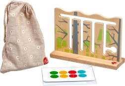 Ta wysokiej jakości drewniana gra oferuje intuicyjne przesuwanie kolorowych kołeczków ze zwierzątkami po frezowanych prowadnicach. Dzięki 6 dwustronnym kartom z wzorami dzieci ćwiczą koordynację ręka–oko, cierpliwość i koncentrację. Po zakończeniu zabawy wszystkie elementy można łatwo schować do lnianego woreczka.