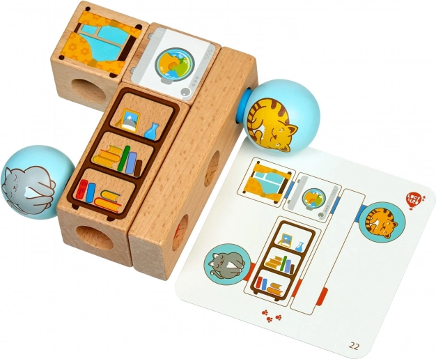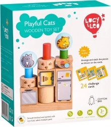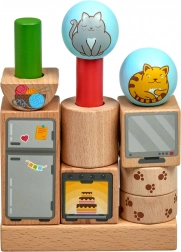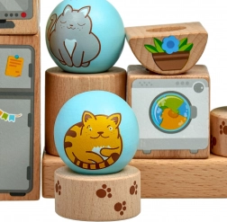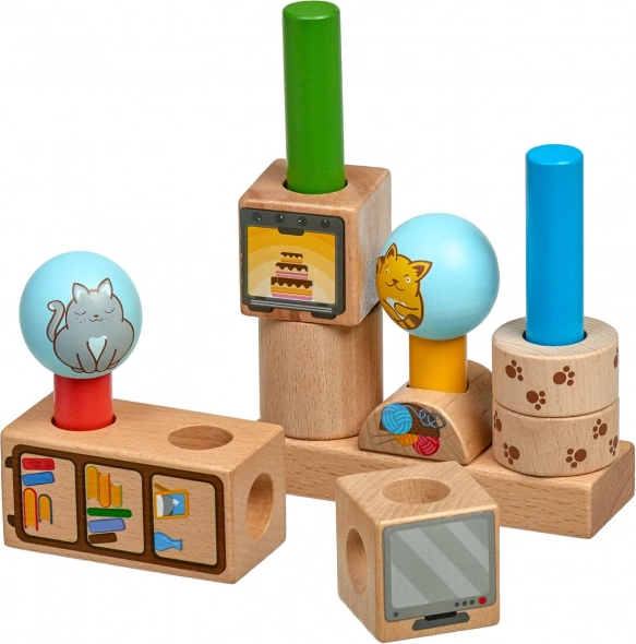 Trwałe drewniane kształty z gładko szlifowaną powierzchnią i ilustrowanymi motywami kotków oraz przedmiotów. Idealne dla małych dziecięcych rączek.