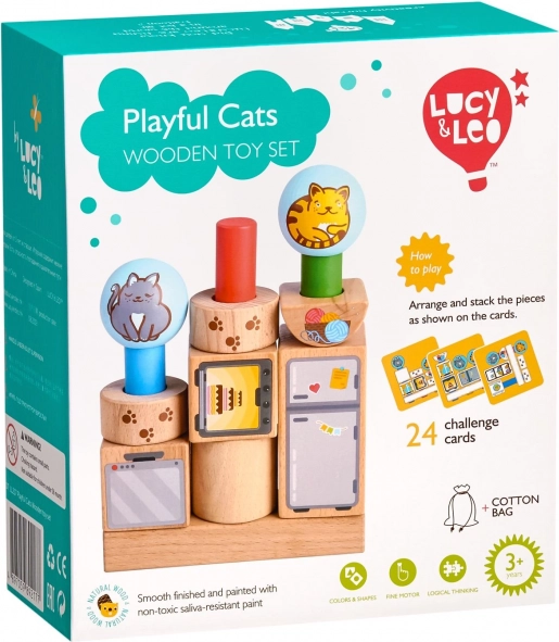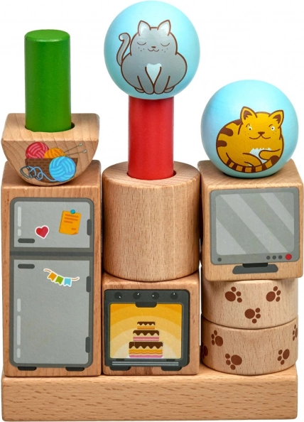 - Solidne drewniane elementy z wesołymi ilustracjami kotów i domowych przedmiotów