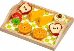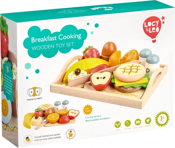 Ten drewniany zestaw do zabawy wiernie odwzorowuje bogate śniadanie na tacy i zaprasza dzieci do nieskończonej porcji wyobraźni. Poszczególne kawałki produktów są połączone magnesami, więc dzieci mogą wielokrotnie „kroić” je drewnianym nożem na deseczce i ponownie składać. Wspiera to naturalne uczenie się, koordynację ręka-oko oraz naśladowanie czynności dorosłych.