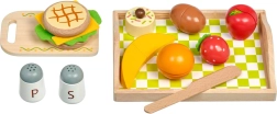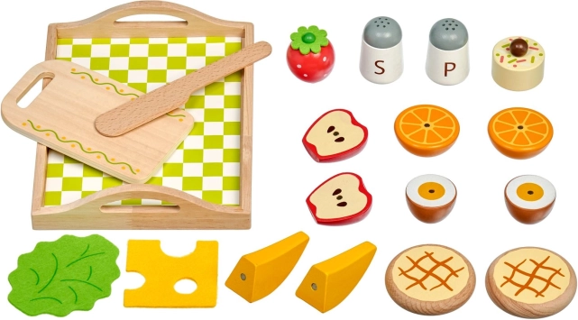 Zestaw zawiera wszystko dla małych kucharzy: tacę w kratkę, deseczkę, nóż, solniczkę i pieprzniczkę, a także bogaty wybór produktów – pieczywo, ser i sałatę, jajko, banana, jabłko, pomarańczę, truskawkę oraz małe ciastko. Nacisk na wysokiej jakości materiały i trwałe wykonanie gwarantuje długą żywotność i bezpieczną zabawę.