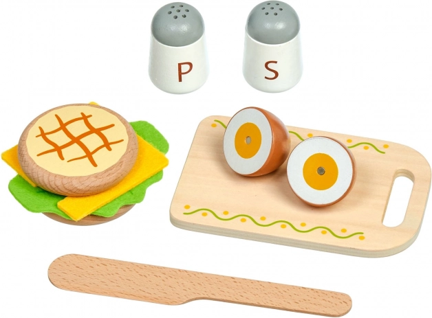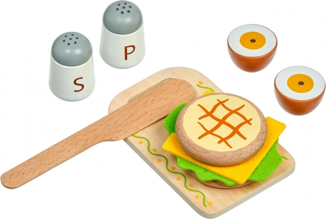 Solidne drewniane elementy uzupełniają tekstylne plastry sera i sałaty. Trwałe wykonanie i nasycone kolory zapewniają długą i bezpieczną zabawę.
