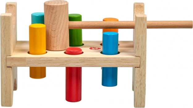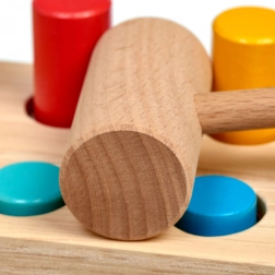 Sześć kolorowych kołków i drewniany młoteczek uczą dzieci precyzyjnego chwytu, siły uderzenia i koordynacji ręka–oko.