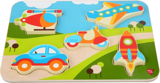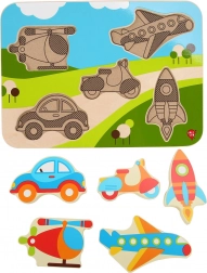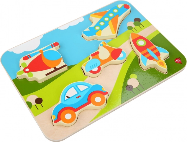 Ta wysokiej jakości drewniana układanka–wkladanka z motywem środków transportu zachwyca wyrazistymi kolorami i czytelnymi kształtami, które dzieci łatwo chwytają i umieszczają na swoim miejscu. Niektóre elementy dzięki swojej grubości mogą samodzielnie stać, więc dzieci mogą bawić się nimi także poza podkładką.