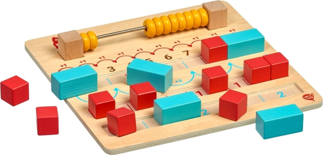Żółte koraliki na liczydle i frezowane rowki pokazują dzieciom, jak krok po kroku rozwiązywać proste zadania. Łatwo zrozumieją, ile dodać lub odjąć.