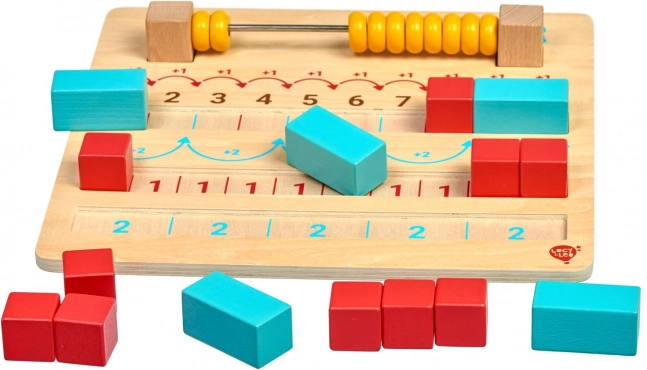 - Drewniana tablica z liczydłem, 10 czerwonych kostek, 5 niebieskich prostopadłościanów