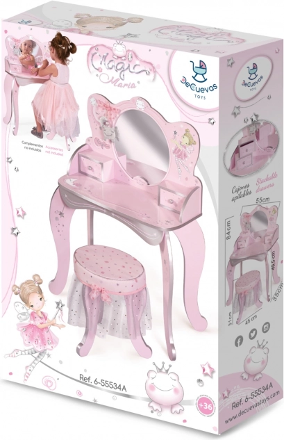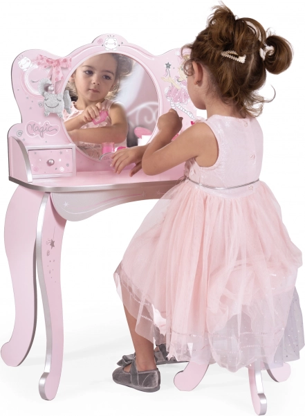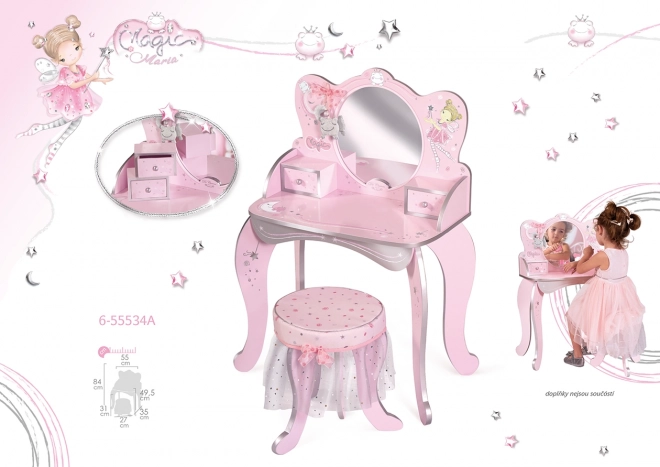 Ta drewniana toaletka inspirowana jest bajką i jest idealnym dodatkiem do każdego pokoju dziewczynki. Jest ozdobiona pięknymi nadrukami i zawiera