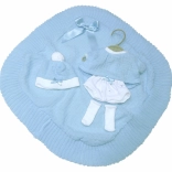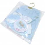 Eleganckie 4-częściowe ubranko dla lalki New Born o wielkości 35-36 cm zawiera ozdobny kocyk z kokardą. Idealny zestaw do zabawy i stylizacji Twojej lalki.
