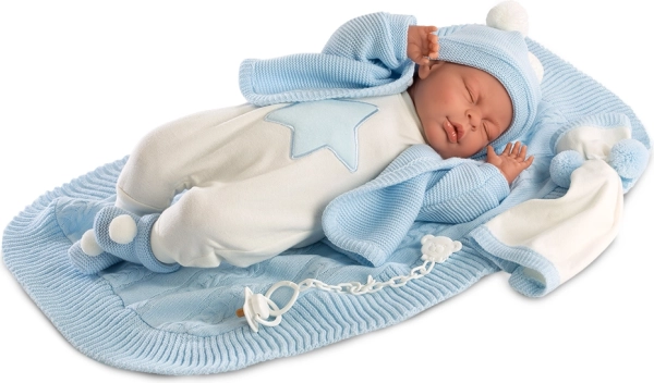Elegancki strój dla lalki niemowlę Llorens z ozdobną chusteczką i mięciutką chusteczką z pomponikami, idealny dla lalek o wielkości 40-42 cm.