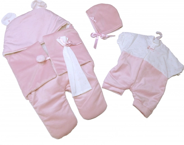 Ten piękny zestaw dla lalek jest wyprodukowany w Hiszpanii i zawiera dwuczęściowy zestaw, który jest idealny dla lalek NOWORODEK o rozmiarze 40-42 cm. Garnitur jest dostarczany z aksamitnym szybkim śpiworkiem do fotelika samochodowego i ozdobną chusteczką, co dodaje lalkom realistyczny wygląd.
