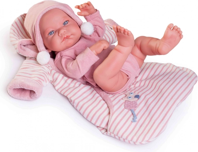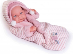 Ta ręcznie wykonana hiszpańska lalka przedstawia noworodka z wyjątkowo wiernie odwzorowanymi fałdkami niemowlęcymi i detalami anatomicznymi. Całe ciało jest z miękkiego winylu, który jest delikatny w dotyku i wytrzymały podczas codziennej zabawy. Lalkę można także kąpać – należy jednak uważać, aby nie zamoczyć rzęs.