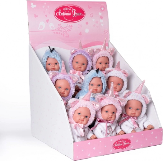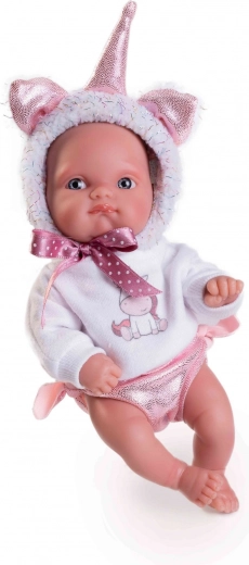 Przytulny biały komplecik z różowymi detalami, uszkami i rogiem pobudza wyobraźnię i czyni z lalki czarodziejskiego towarzysza codziennej zabawy.