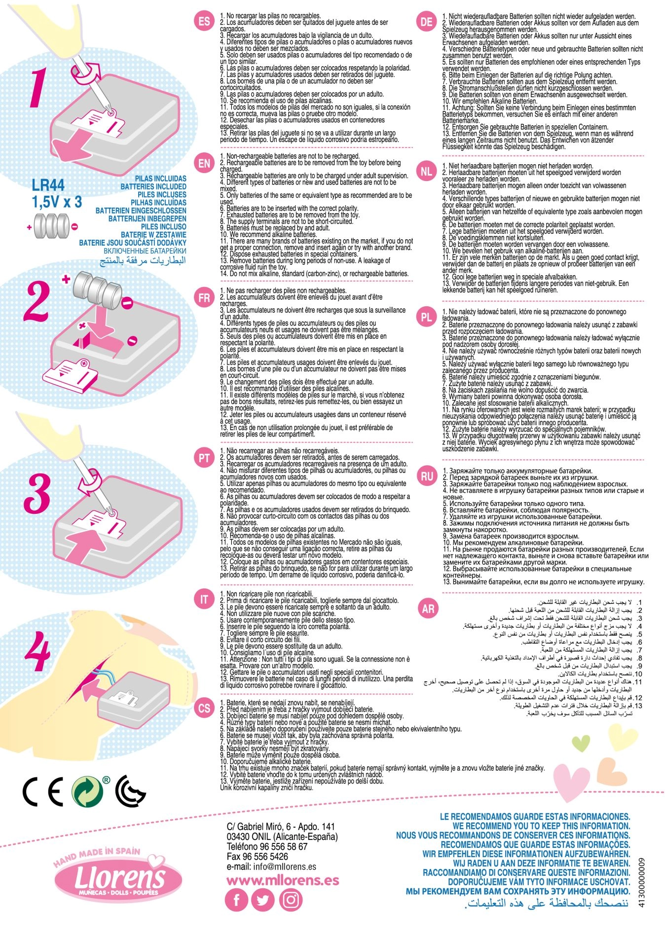 Lalka jest ręcznie wykonana w Hiszpanii z naciskiem na jakość i detal. Zapakowana w eleganckie pudełko prezentowe, doskonale nadaje się na prezent. Do lalki można dokupić oryginalne ubranka z oferty Llorens w rozmiarze 33 cm. W zestawie znajdują się baterie, dzięki czemu po wyjęciu blokady lalka jest od razu gotowa do zabawy.