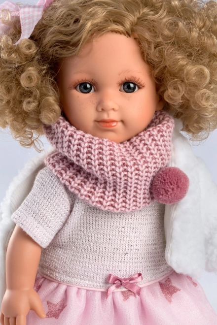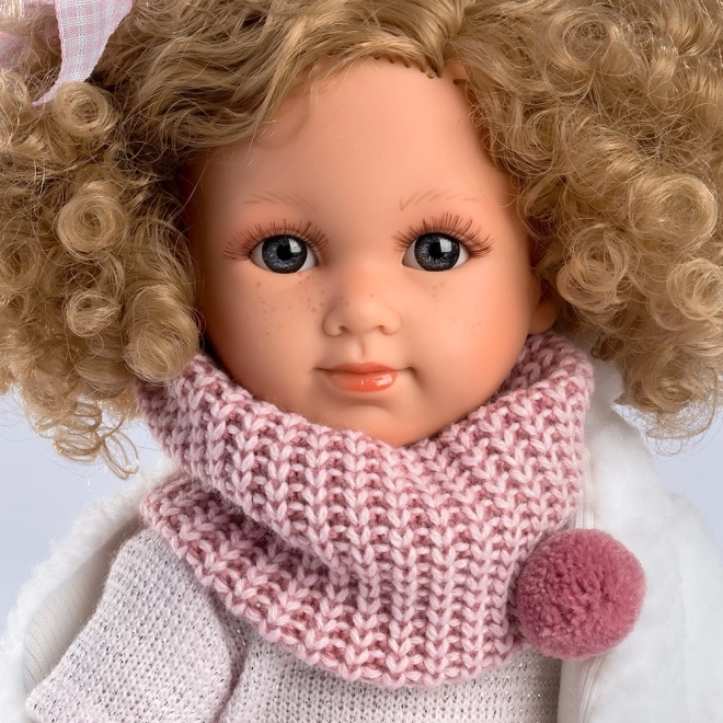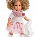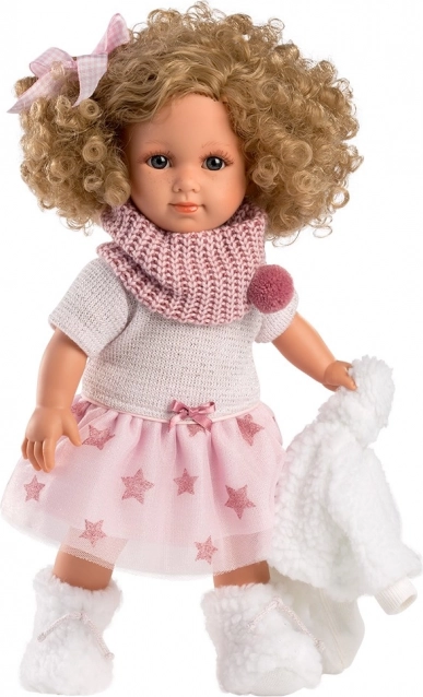 Lalka Elena ma na sobie modną sukienkę z wzorem gwiazdek, szalik z pomponem i białe buty, co nadaje jej unikalny wygląd.