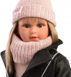 Carla nosi nowoczesny zestaw: czarną kurtkę „biker” z eko‑skóry, ciemną spódnicę z motywem lisów, dzierganą różową czapkę z pomponem, komin, skarpetki i buciki. Nie brakuje też małej dzierganej torebki. Dzięki normom bezpieczeństwa UE zabawa lalką jest maksymalnie bezpieczna. Dostarczana w ozdobnym pudełku prezentowym, idealna na prezent.